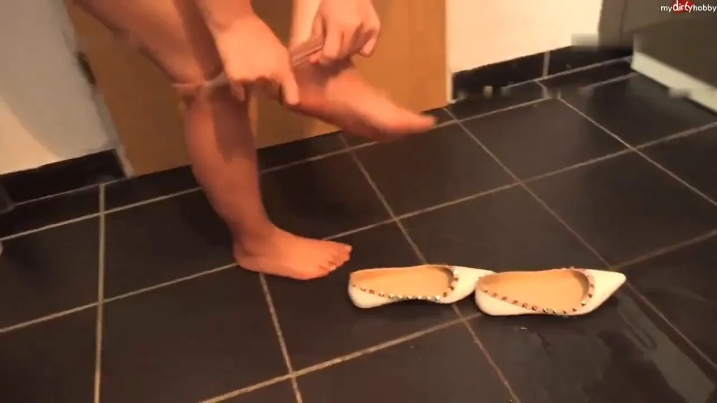 Blonde with bangs and a tattoo on her right leg bends over a white stool in a kitchen, ass out, hands on the counter. Dude in a black shirt and short hair is on his knees, face buried between her legs at first, then fucking her from behind. They go into doggy on the floor, her legs spread wide, him slamming into her while she sags forward. Camera stays wide most of the time, full body shots, no cuts to fake moaning faces. Lighting’s flat, indoor kitchen with appliances in frame — you see wine glasses, the fridge, everything’s clean but they’re making a mess. She’s slim, tight body, he’s muscular but not huge, moves in rough, steady strokes. Final scene has her leaning on the stool again, barefoot, shoes tossed aside, totally drained.