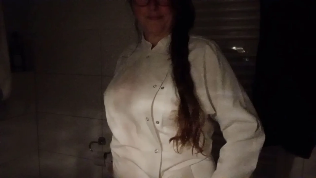 Oh la la is the only girl in this one — slim brunette, long brown braid, wearing a white chef’s coat and clear plastic gloves. She starts off alone in a dim tiled room, adjusting her gloves like she’s prepping for something clinical, then slowly unbuttons her coat. You get close-ups of her hands working the buttons, the plastic snapping tight around her fingers. She’s not wearing anything under the coat, and once it’s open, she just stands there — pale skin, small tits with pink nipples, totally exposed. The camera stays tight, static shots, like surveillance footage. There’s no partner, no dialogue — just her undressing, touching herself minimally, maybe a hand on her hip, then pulling the coat off completely. The whole thing feels voyeuristic, like you’re watching someone private and focused. Lighting is flat, dim, almost sterile — matches the kitchen-tile backdrop. It’s not about performance; it’s about the quiet, awkward tension of being watched while doing something ordinary turned sexual. She never jerks off or eats pussy, just strips and poses, the gloves staying on the whole time. The vibe is weirdly hot because it’s so low-key and weirdly formal.