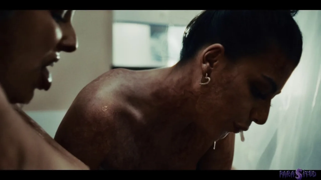 Leana Lovings is lying on a bed, barely moving, eyes closed, wearing nothing but blue sheets tucked halfway down her slim frame. She’s got tattoos on her face and arms — subtle but noticeable ink that fits her vibe. Gal Ritchie finds her in the bathroom next, crouched near the toilet, hand over her mouth like she’s gagging or just came up from deepthroat. They start going at it in the shower, both naked, breasts out, Gal on her knees eating Leana out with her face buried in close. The camera stays tight the whole time — you see every flick of the tongue, every twitch in Leana’s legs as she grabs Gal’s head. Their chemistry isn’t loud or performative, but it’s physical, raw, focused on mouth and touch more than talking or eye contact.
