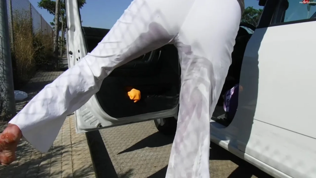 Skinny brunette in her 30s, barefoot and wearing tight white pants, hanging around a parked white car in broad daylight. She’s at what looks like a driver’s education lot — flat open space, no privacy, just streetlights and pavement. She pulls down her pants to expose her ass, bends over the car, and takes it hard from behind. Guy’s slamming into her in doggy while she stays completely quiet, just gripping the roof. Later she drops to her knees, unzips him, and sucks cock with her mouth wide open — not rushed, actually deep throat work. Camera stays tight on the action, lots of close-ups on her legs, ass, and face during the blowjob. Feels sneaky, almost like a hidden cam vibe, but staged — she knows exactly where the lens is.