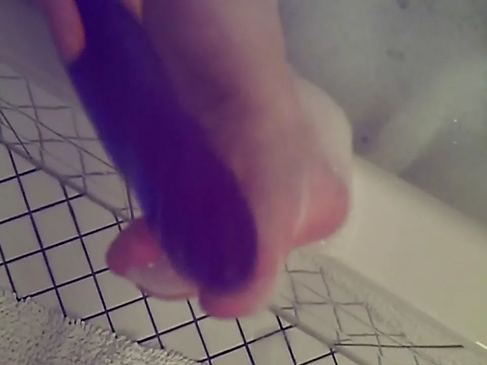 A slim brunette in her 20s sits on a bathroom floor, bare feet in frame from a low POV. She’s rubbing a small vibrator slowly between her toes, then drags it up along her sole — close-ups show every twitch and shiver. The lighting’s dim, just enough to see the glossy shine on her feet and the condensation on the tiles. After a few minutes, she shifts and starts pressing the vibrator against her clit, still using her feet to guide it, arching her back off the mat. Her moans are quiet but sharp, like she’s trying not to be heard. The whole thing stays tight in frame — no cuts, just her hands, feet, and the toy working in sync.